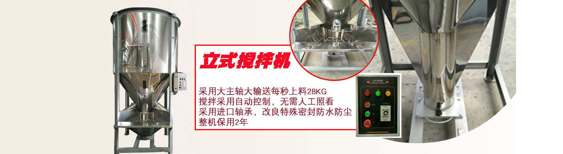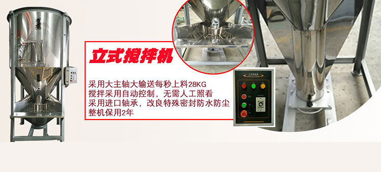 本公司專業生產塑料烘干機、攪拌干燥機、立式拌料機、塑料拌料機、塑料攪拌機、立式攪拌機、塑料混料機、不銹鋼攪拌機、螺旋上料機、彈簧上料機、粉體攪拌機、臥式攪拌機、食品上料機、攪拌烘干機、塑料拌料機、立式混色機、塑料混合機、大型立式攪拌機等注塑機周邊設備。我司經過多年的努力和研究,在攪拌粉末料這方面有了重大的突破。引得了很多客戶的肯定,特別是在國內市場備受歡迎。